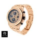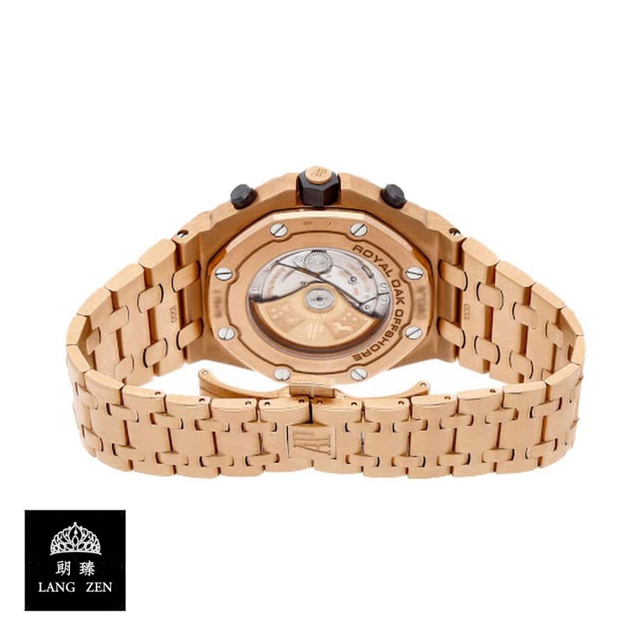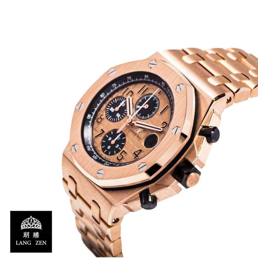 The Audemars Piguet Royal Oak Offshore Replica in Rose Gold is a luxury watch. Its 904L stainless steel case is 42.00 mm in size and 14.18 mm thick. with a pink gold color and sapphire crystal. The Royal Oak bracelet is adjustable and made of 904L stainless steel with a pink gold color. The champagne dial features stick and dot indices. with 904L stainless steel Royal Oak hands.