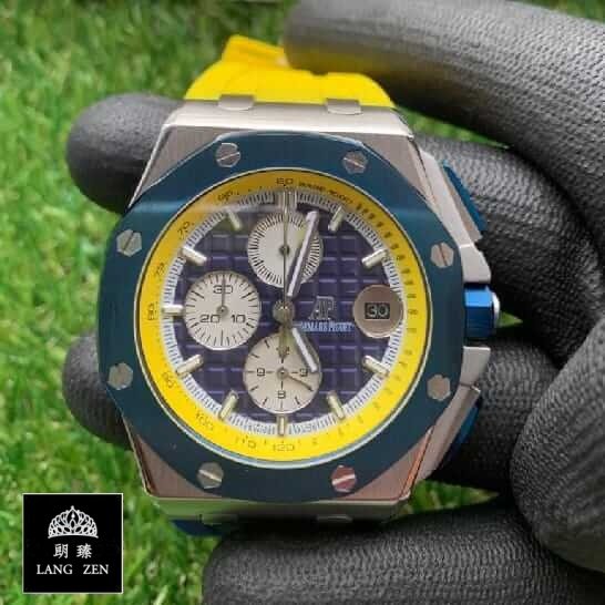 Audemars Piguet Royal Oak Offshore Ryder Cup Europe Replica watch. This timepiece boasts an automatic movement with a caliber of AP 3126 / 3840. ensuring a power reserve of approximately 60 hours. Precision is promised within COSC certification limits. guaranteeing only -3/+3 seconds/day deviation. Its case. a robust 904L stainless steel. features a stylish steel-blue color. complemented perfectly by a stainless steel bezel of the same color. A sapphire crystal graces the watch. adding a touch of luxury and durability.