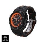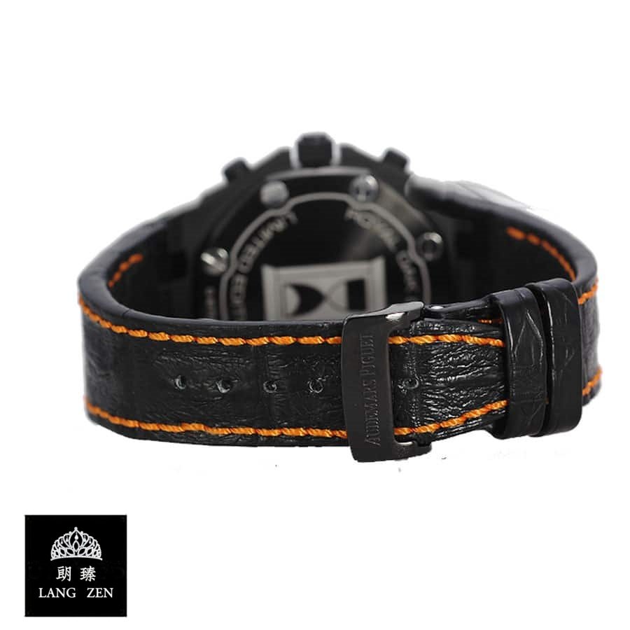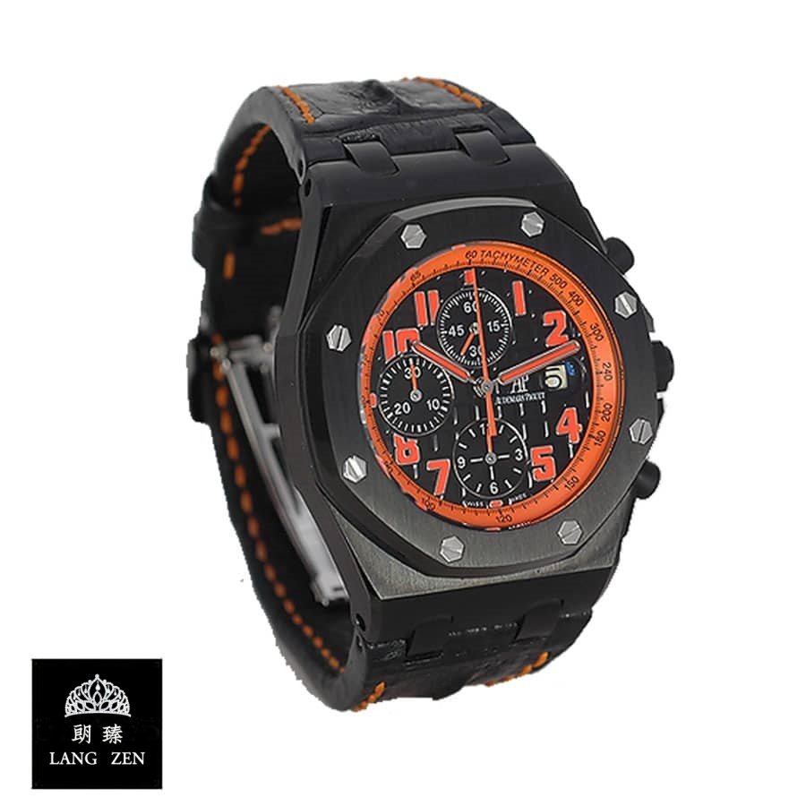 The Audemars Piguet Royal Oak Offshore Replica is a 1:1 super clone Swiss mechanism watch. It features a 904L stainless steel case and bezel. both in black. and a sapphire crystal. The movement is an Automatic AP 2326 / 2840 with a power reserve of 60 hours and a precision of (-3/+3 sec/day) within COSC certification limits. The dial is black with Arabic numerals and 904L stainless steel stick hands. The bracelet is genuine leather stitched Hornback Alligator Leather in black and orange. with an adjustable 904L stainless steel deployant clasp.