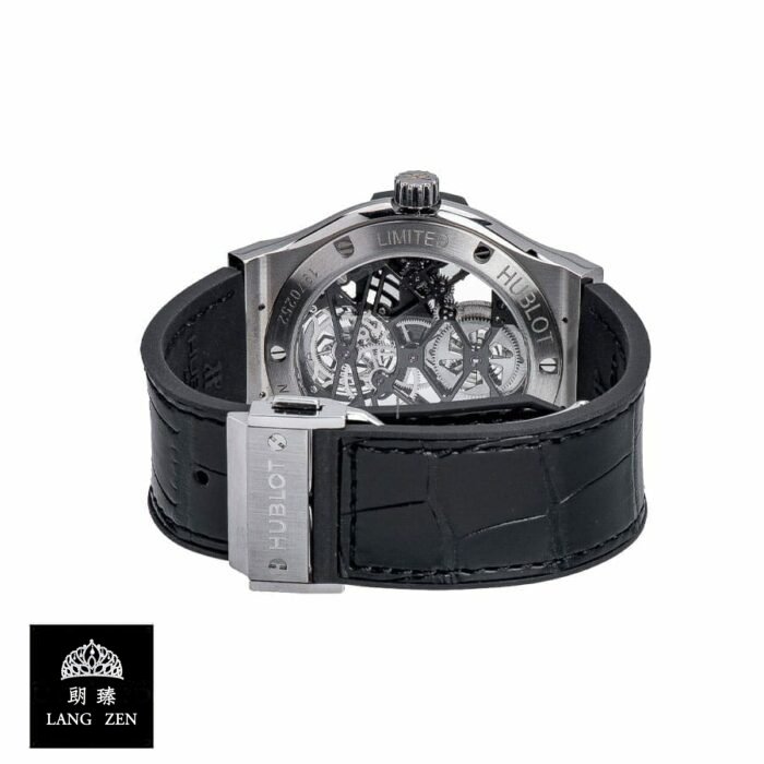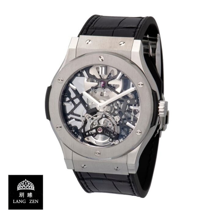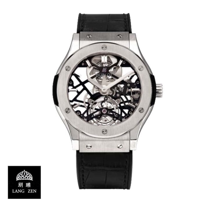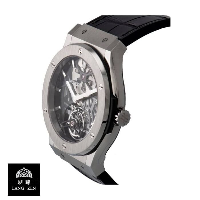 The Hublot Classic Fusion Tourbillon Skeleton Dial 505.NX.0170.LR Replica is a luxury watch. It features an automatic movement with a caliber of HUB6010.H1.1 and a power reserve of 60 hours. The case is made of titanium and is 45.00 mm in size. The bezel is also made of titanium and is transparent in color. The crystal is made of sapphire glass and the bracelet is made of alligator skin with an adjustable link and a 904L stainless steel deployant clasp.