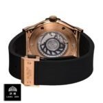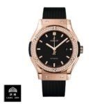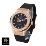 The Hublot Classic Fusion with Iced Out Black Dial Replica is a luxurious watch from the Big Bang family. It features an automatic movement with a 60-hour power reserve and precision of -3/+3 seconds per day within COSC certification limits. The case is made of 904L stainless steel with a rose gold color and a gem-set bezel. The bracelet is made of rubber with adjustable links and a 904L stainless steel fold clasp in rose gold.