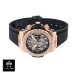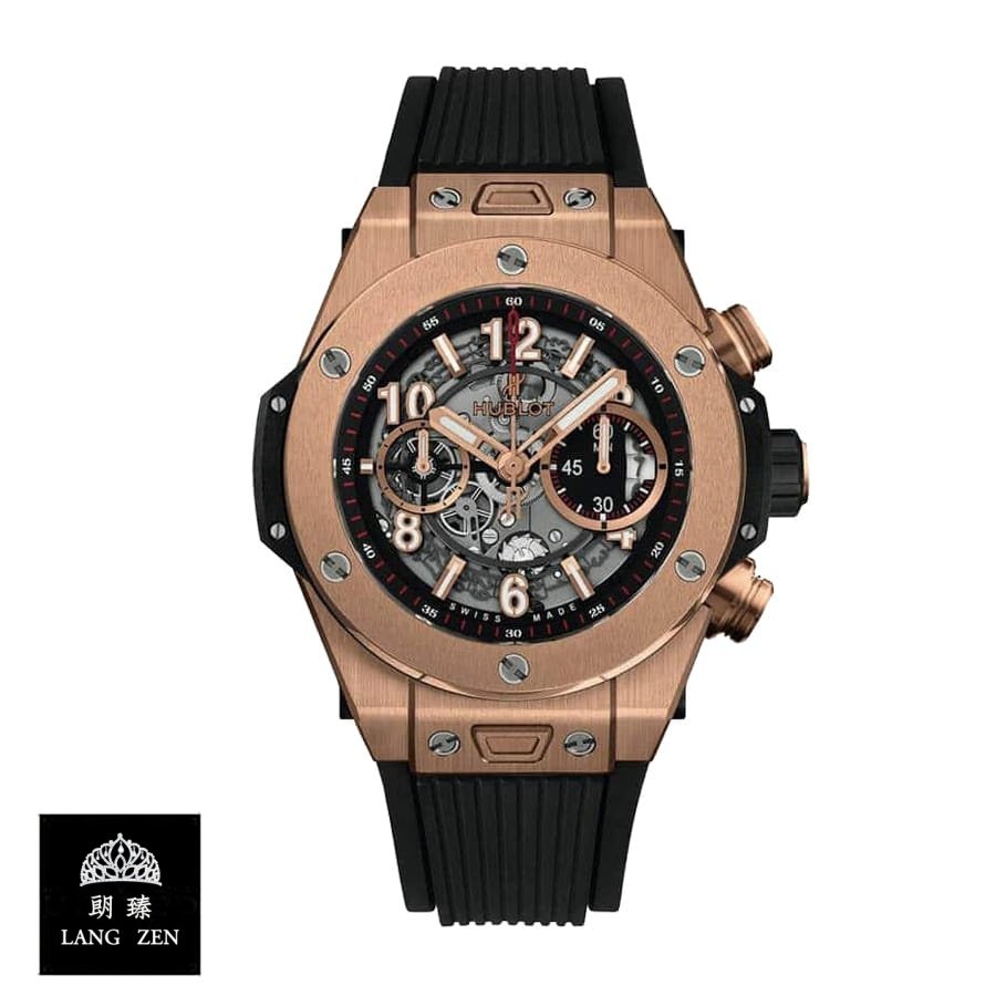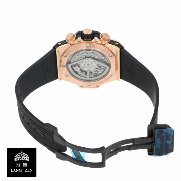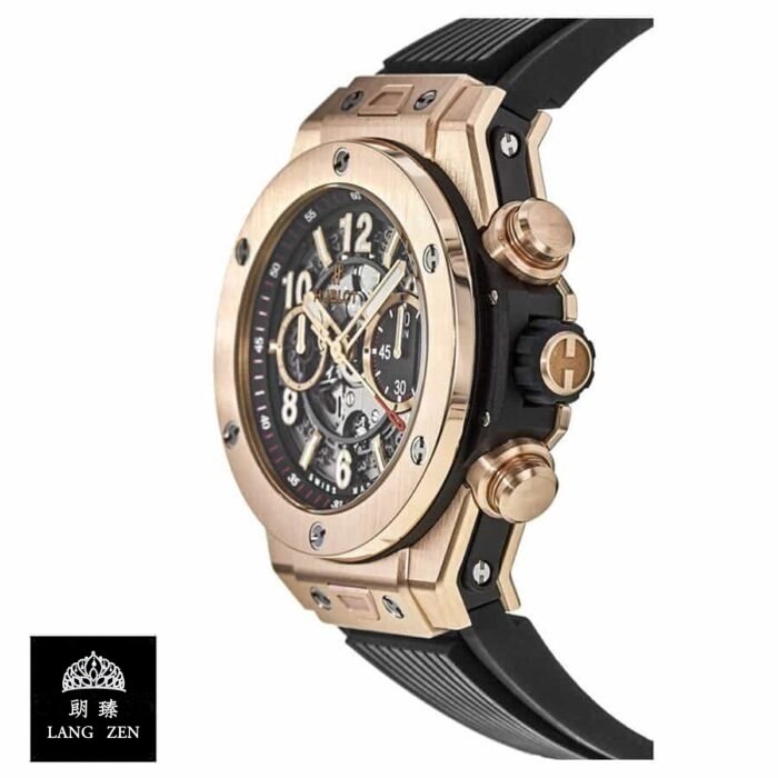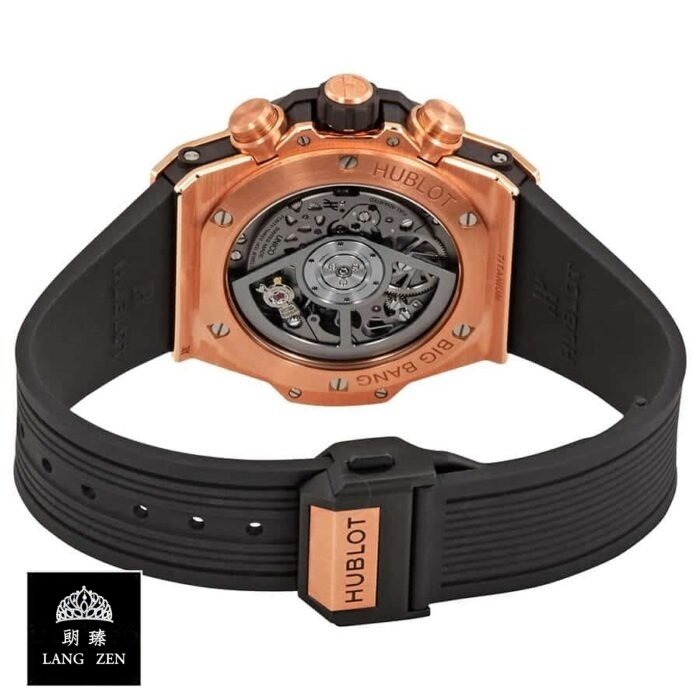 The Hublot Big Bang Unico King Gold Flyback Chronograph Skeleton 441.OX.1180.RX Skeleton Replica is a luxurious watch. It features a 904L stainless steel case with a rose gold color and a sapphire crystal. The movement is an automatic caliber HUB1240 with a power reserve of 60 hours and a precision of (-3/+3 sec/day) within COSC certification limits. The second hand has a sweep motion. The bracelet is made of rubber with adjustable links and a 904L stainless steel fold clasp in black and rose gold.