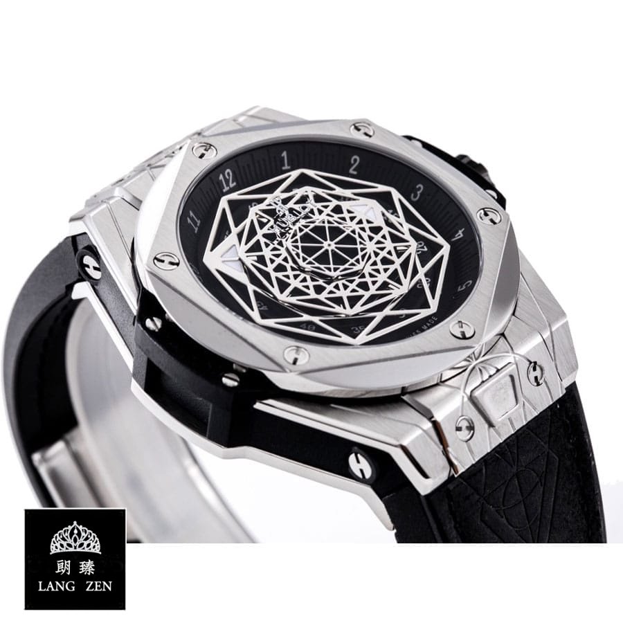 The Hublot Big Bang Sang Bleu 415.NX.1112.VR.MXM16 Replica is a luxury watch. It features a 904L stainless steel case and bezel. with a diamond-studded bezel. The case is 45.00 mm in size and 14.00 mm thick. The black leather bracelet is adjustable and features a 904L stainless steel fold clasp. The black dial features stick and dot indices. and 904L stainless steel stick hands.