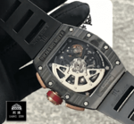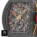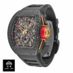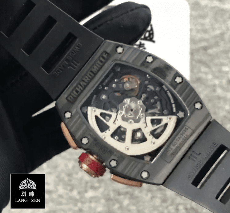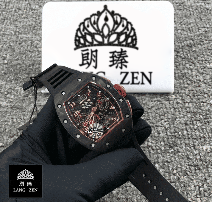 The Richard Mille RM011 Romain Lotus F1 Rose Gold NTPT Carbon Replica is a luxurious watch with a unique design. The watch features an automatic movement with a 7750 caliber and a power reserve of 60 hours. It is certified within COSC limits for precision and has a sweep motion second hand. The case is made of carbon and is black in color. with a carbon bezel of the same color. The crystal is sapphire and the size is 50.00 mm. The bracelet is made of rubber and is adjustable for all sizes. with a 904L stainless steel double-fold clasp.