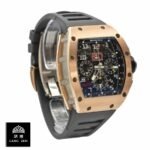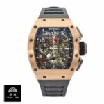 The Richard Mille Felipe Massa RM 011RG Flyback Chronograph Limited Edition Replica is a luxurious watch crafted with precision and care. The 904L stainless steel case is rose gold in color and has a sapphire crystal for added protection. The movement is an automatic RMAC3 caliber with a power reserve of 60 hours and a precision of -3/+3 seconds per day within COSC certification limits. The second hand has a sweep motion.