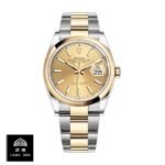 The Rolex 126303 Oyster Replica is a Datejust 41 watch with an automatic movement and caliber 3235. It has a power reserve of 60 hours and is within COSC certification limits for precision. The case is made of 904L stainless steel and has a yellow gold bezel. The crystal is sapphire and the size is 41.00 mm with a thickness of 12.00 mm. The bracelet is also 904L stainless steel with adjustable links and a fold clasp in yellow gold and steel. The dial is champagne with stick indices and hands made of 904L stainless steel. It has the functions of hours. minutes. seconds. date. and chronometer. The watch has passed the 30m water resistance test and is under a full 2 years International warranty.