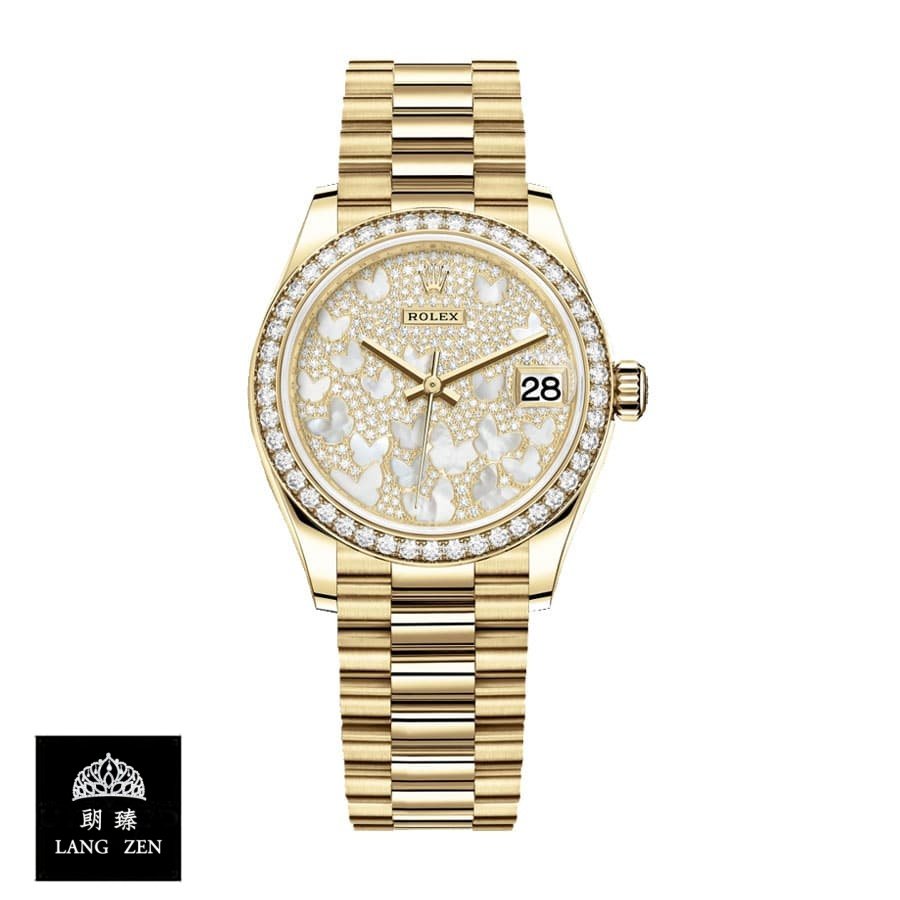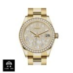 This Rolex Datejust 278288RBR-0011 Yellow Gold And Diamond Automatic Mother Pearl Butterfly Dial Oyster Replica is a high quality watch. It features a 904L stainless steel case with a yellow gold color and a gem-set bezel. The sapphire crystal is 31.00mm in size and the movement is an automatic caliber 2236 with a 60-hour power reserve and a sweep motion second hand. The bracelet is a 904L stainless steel oyster with adjustable links and a fold clasp in yellow gold. The dial is a white mother pearl butterfly with gem-set indices and 904L stainless steel hands.