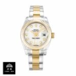 This Rolex Datejust Yellow Gold Diamond 179173 Oyster Replica is a stunning watch. It features a 904L stainless steel case with a yellow gold and steel color. a sapphire crystal. and a 26.00 mm size. The bracelet is also made of 904L stainless steel with an adjustable link and a fold clasp in black. The dial is white with gem-set indices and 904L stainless steel stick hands.
