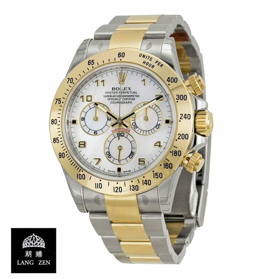 The Rolex Daytona Two Tone White Dial 116523 Oyster Replica is a stunning watch. It features a 904L stainless steel case with a yellow gold and steel color. a sapphire crystal. and a 40.00 mm size and 12.30mm thickness. The bracelet is also made of 904L stainless steel with an adjustable link and a fold clasp in yellow gold and steel. The dial is white with gem and dot indices. 904L stainless steel hour markers and stick hands.