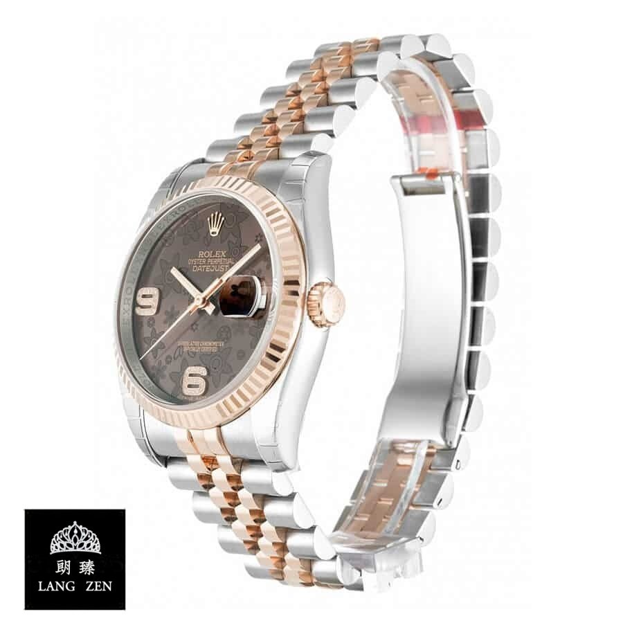 The Rolex Datejust 36 Chocolate Floral Dial 116231-0105 Jubilee Replica is a stunning watch. It features a 904L stainless steel case with a rose gold and steel bezel. and a sapphire crystal. The 36.00 mm case is 12.00 mm thick. The movement is an automatic caliber 3135 with a 60-hour power reserve and precision of -3/+3 sec/day within COSC certification limits. The dial is brown with Arabic numerals and 904L stainless steel hour markers. The hands are stick-style and made of 904L stainless steel. The Jubilee bracelet is adjustable and made of 904L stainless steel with a deployant clasp in rose gold and steel.
