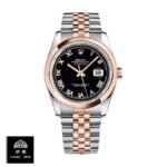 This Rolex Datejust 36 replica is a perfect 1:1 clone of the original. It features a 904L stainless steel case with a rose gold bezel and sapphire crystal. The 36.00 mm case is 12.00 mm thick and is paired with a 904L stainless steel Jubilee bracelet in rose gold and steel. The black dial features Roman numerals and 904L stainless steel stick hands.